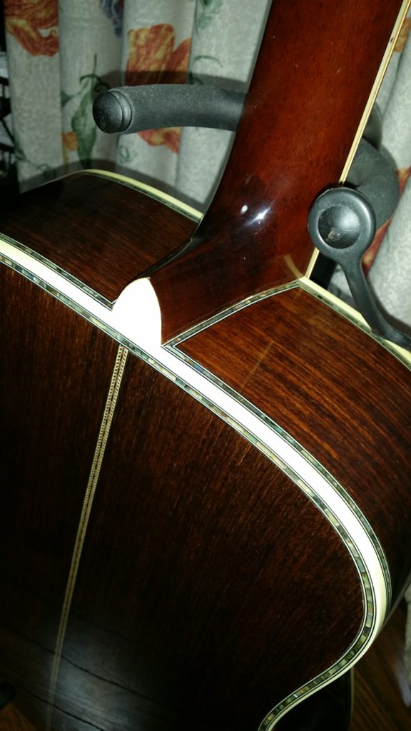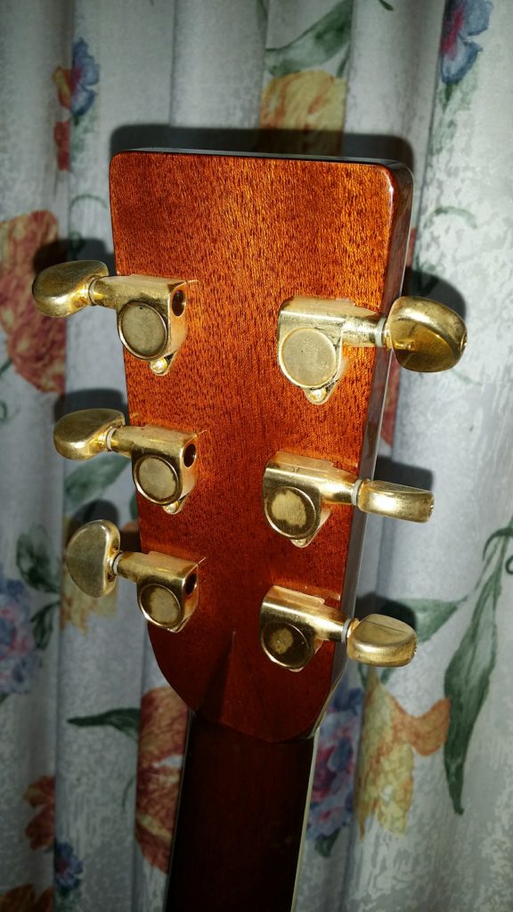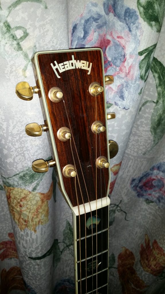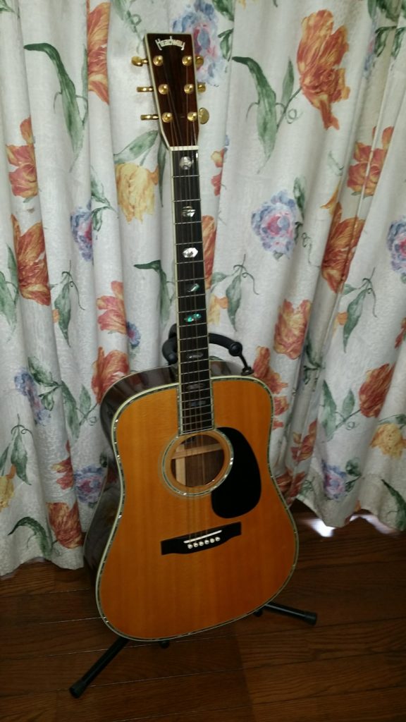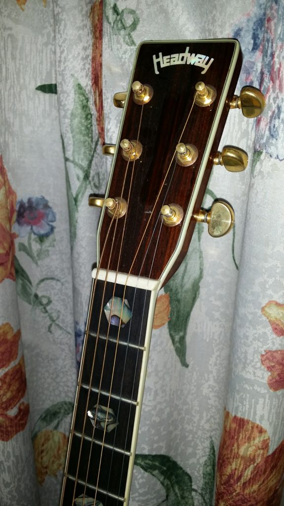 このHCD-45ASはイレギュラーモデルである。本来ヘッドの形状がオリジナルの形状をしているのだが、説明によれば製造時の手違いで写真のようなマーチンヘッドになってしまったようである。ただこれはむしろラッキーで、HEADWAYの最高峰モデルHD-220と同じ形状を呈している。以後オークションやネット販売で同様のヘッド形状をしたこのモデルは見ていない。2000年代の中華製ギダーだけあって、そこそこの鳴りであり、全体的に重さも控えめである。10万円台で、お手軽にD-45の雰囲気を味わうことができるのは、コストパフォーマンスに優れている。ただ、Ariaの中華製D-45コピーモデルにも言えるのだが、後日入手する本家のD-45の鳴りを体感したときに、その音の違いに本家の凄さを深く感じさせられた。やはりギターは形や装飾だけではないのである。