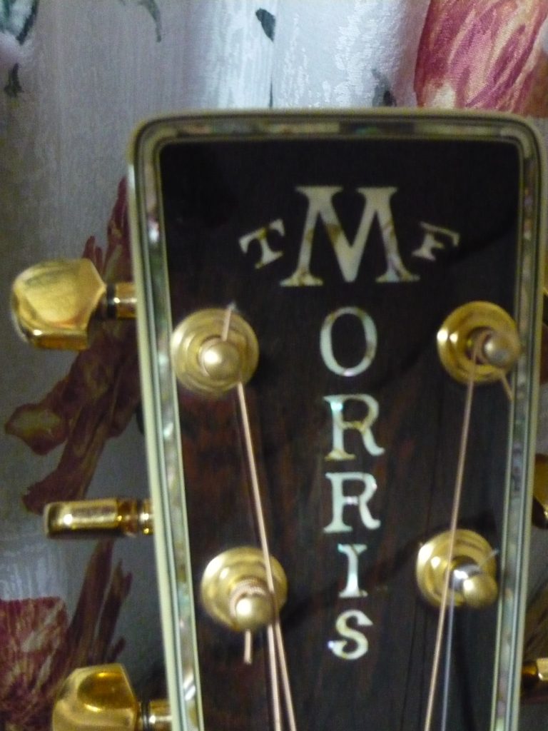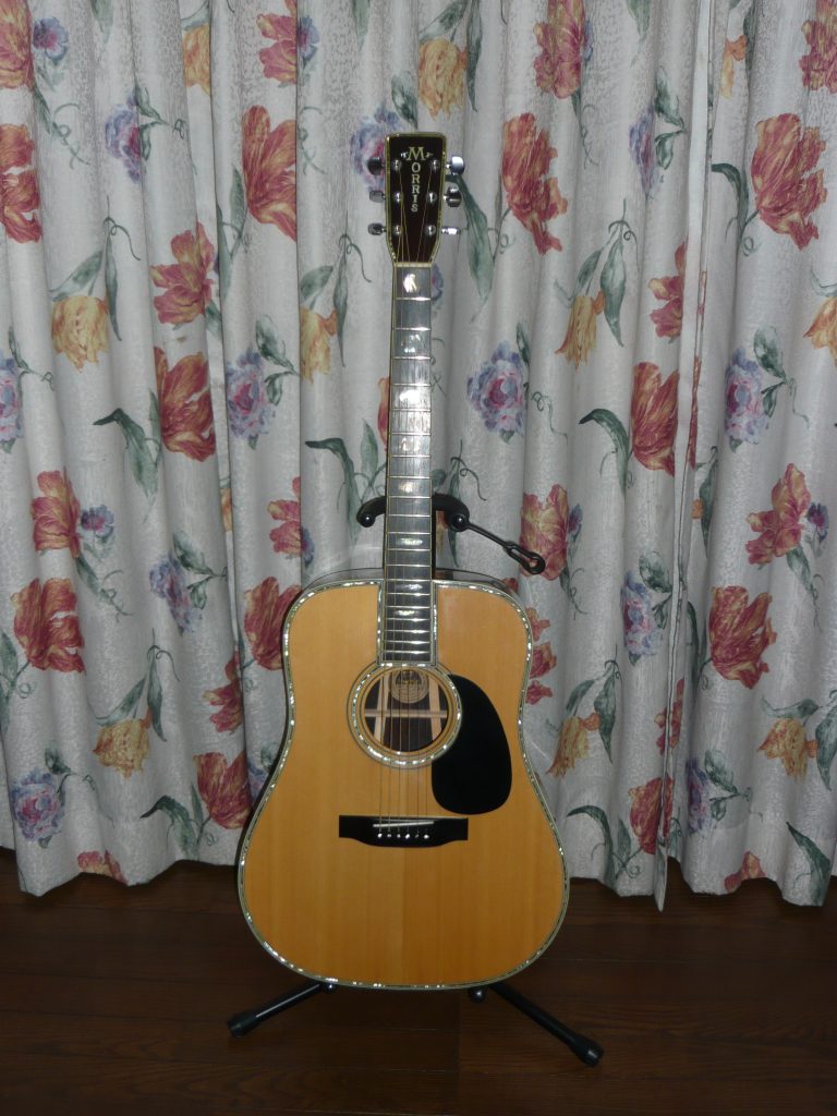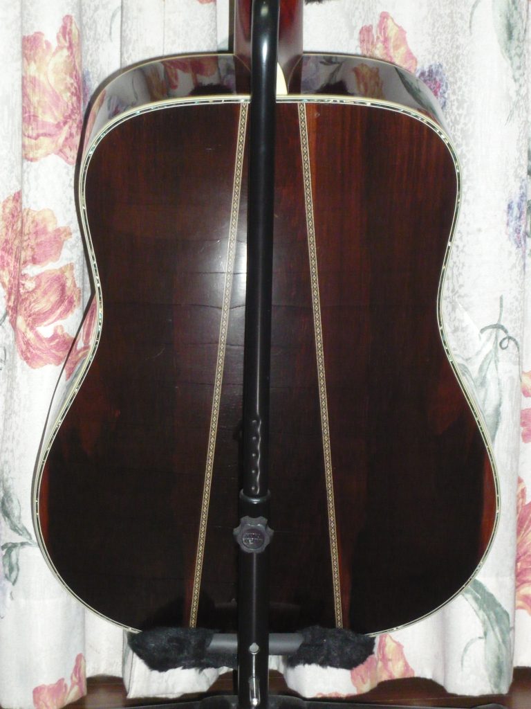 W-150は年に1~3度オークションやネット販売に登場する。ハカランダ単板をうたっているが、裏板が2ピースものは側板は合板。3ピースもののみオール単板。材が枯渇してきているので、当時から2ピース単板は高価であったのだろう。実は入手時からよくなるギダーで、正直なところW-250や300より良い音がする。ボディー全体が振動しているような鳴りを感じる。パーフリングもソリッド物は美しい。ヘッドに入ったアバロンのパーフリングも幅があって迫力をあげている。ただ縦ロゴは上位機種に比べると、貝は1ランク下のような仕上がりである。(それほどW-300は厳選素材で作られているのであろう。)S.Yairiと言われている個体で、高木氏のサイン入り。側板、裏板のパーフリングは、セルロイド模造貝。