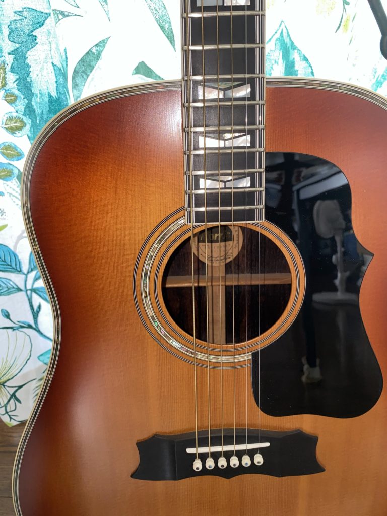 2000年のアリス再始動を記念して発売されたMG-100STの復刻版。ラベルは丸ラベルで、ブリッジ形状が角ばっているのが特徴である。ピックガードもサウンドホールインレイを隠していない。実はこの個体は運命的な歴史がある。2009年頃に一度入手した際に、ハカランダらしい香が、サウンドホールからとてもよく匂っていたことを覚えている。その後所有数が増えて一度オークションで手放した。10年程経って改造されたMG-1200STをオークションんで落札した。オーナーから聞いたところ、関西のショップで30万円以上かけて改造を施したそうである。ヘッドを谷村氏と同じ幅広ヘッドに。指板には2本線のライン。ブリッジをMG-300ST仕様にトラストロッドカバーの追加など変更点は多数である。そしてもっと驚いたのが、裏板のハカランダの木目である。うねる様なその木目は、10年程前に手放した1200STそのものだったのである。まさかの里帰り。このようなめぐり合わせがあるのであろうか。