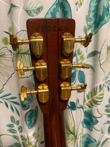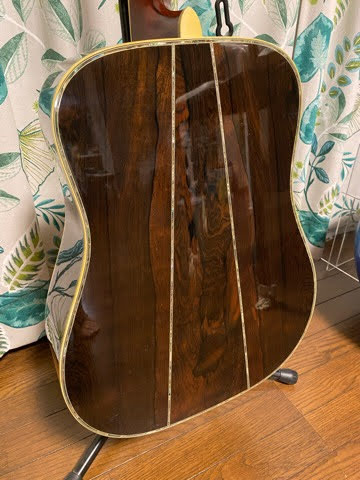 3ピースバックを持つW-300である。インペリアル型のペグボタンをに変わっているが、ハカランダ単板らしい、中高音がブライトな音を奏でている個体である。工房で見てもらったところ、今までに見たことのない手のこった仕事をしているとのこと。確かに他のW–300と比べてもブレーシングの取り付け方が異なり、凝った作りに見える。同時期の最上位機種でも様々である。