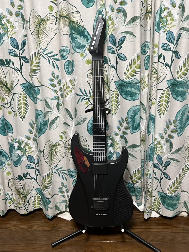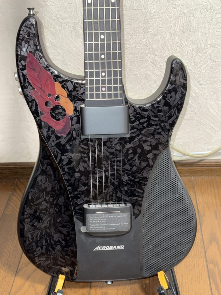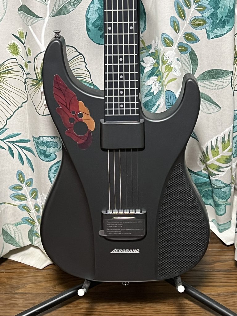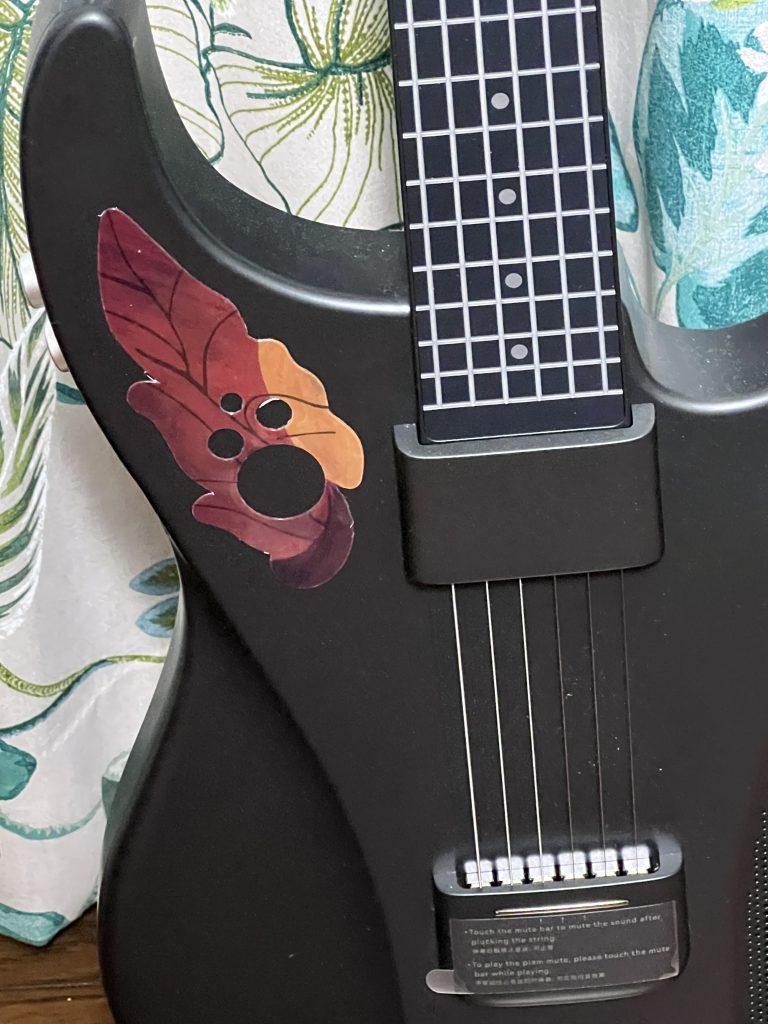 ネック側には減がなく、押さえたフレットの位置で音階を捉えてスピーカーから音が出ます。しっかりと押さえていないときれいに音が出ませんが、練習にはそれがかえっていいです。何と言ってもギター以外にもベースやバンジョー、そしてピアノの音までもが出るので、ピアノが弾けるようになったような錯覚に陥ることができる。キーの変更もボタン操作でできるので、CAPOは不要。専用アプリを介せば、音の微妙な味付けをすることができます。後付けでデザインを変更することができるシールを貼っています。加えてオベーション風デザインのシールを貼ってあります(中華製)
