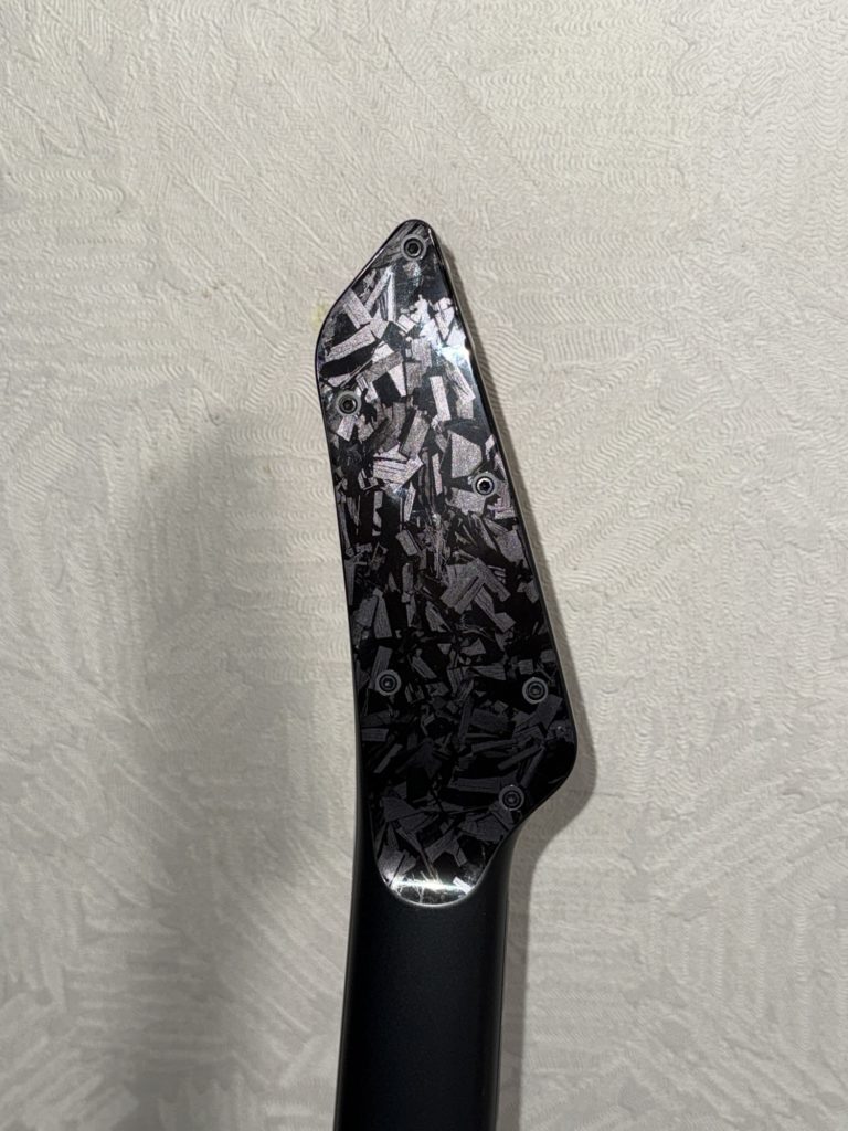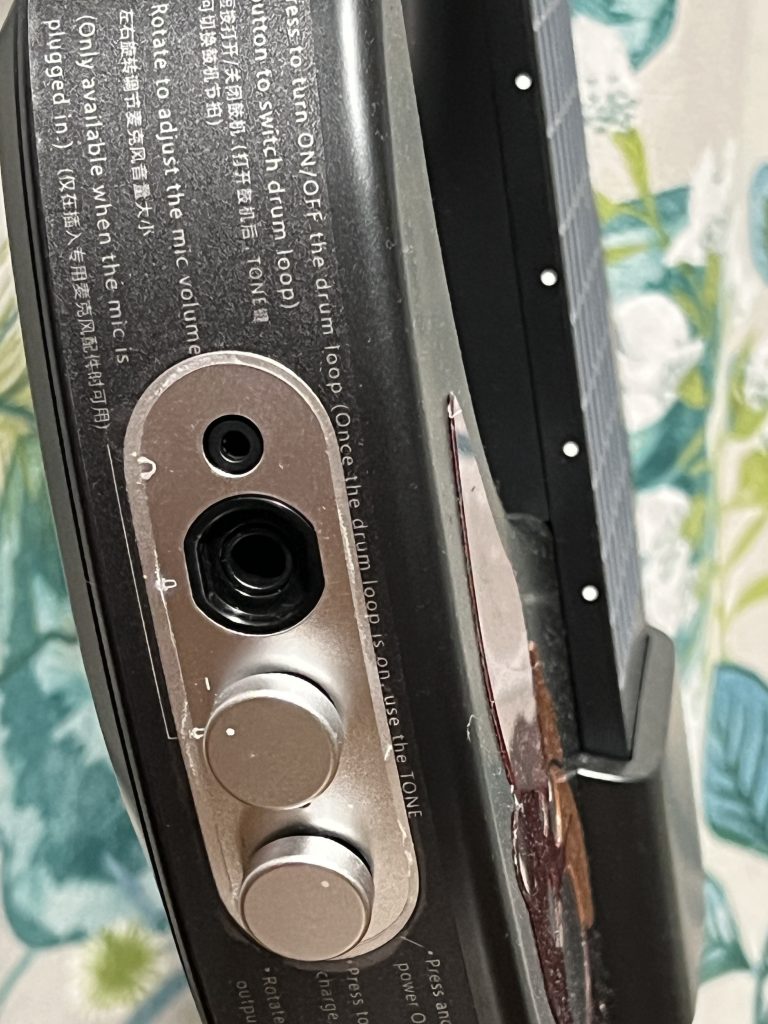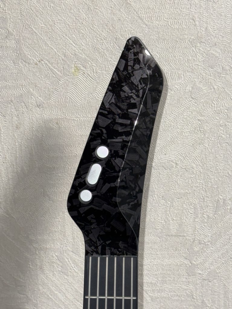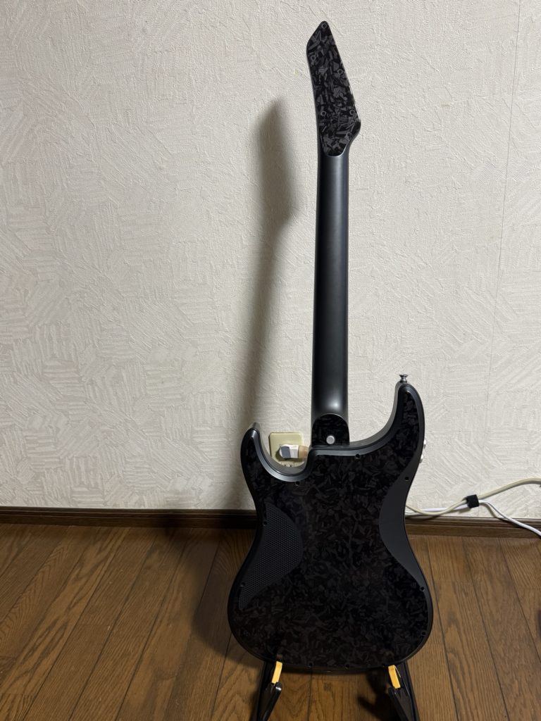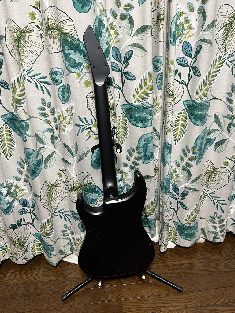 ネック側には減がなく、押さえたフレットの位置で音階を捉えてスピーカーから音が出ます。しっかりと押さえていないときれいに音が出ませんが、練習にはそれがかえっていいです。何と言ってもギター以外にもベースやバンジョー、そしてピアノの音までもが出るので、ピアノが弾けるようになったような錯覚に陥ることができる。キーの変更もボタン操作でできるので、CAPOは不要。専用アプリを介せば、音の微妙な味付けをすることができます。後付けでデザインを変更することができるシールを貼っています。加えてオベーション風デザインのシールを貼ってあります(中華製)