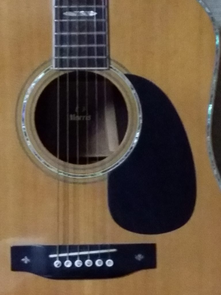 我が青春のギターであるMORRIS W−50であるが、中学生の頃から本アバロンの輝きに強い憧れを持っていた。それから30年 一大決心をして自前でセル模造貝を削り出しラミネートではあるがアバロンパーフリングを入れることとした。職人の技術には到底及ばないが、パッと見では十分である。ブリッジサイドにもスノーフレイクを入れた。黒檀の指板にも憧れがありポジションマークのないフレットのみを塗装した。(塗料は白髪染めである)しかし50年の時の経過でよく鳴る個体である。やはりギターは弾くことで成長する。