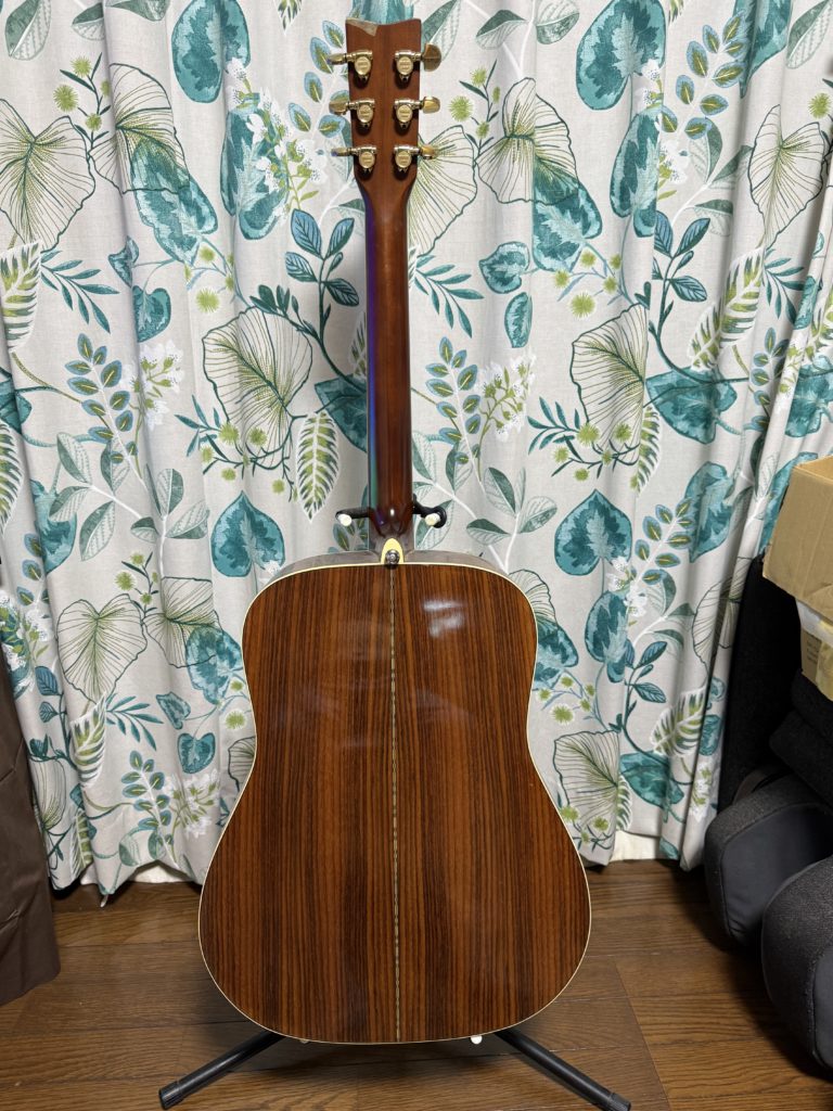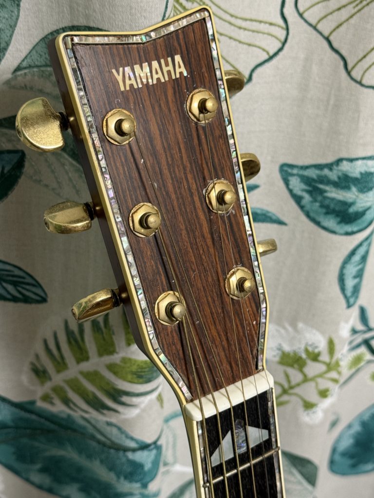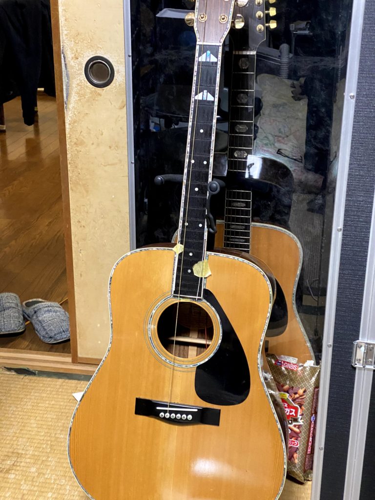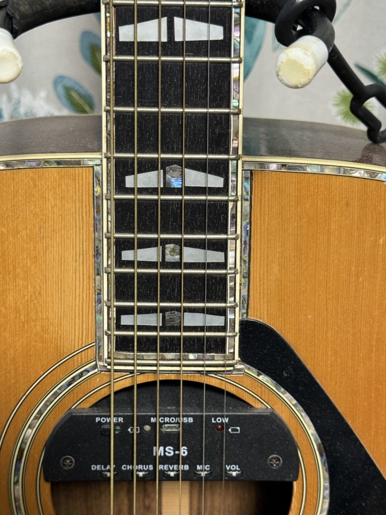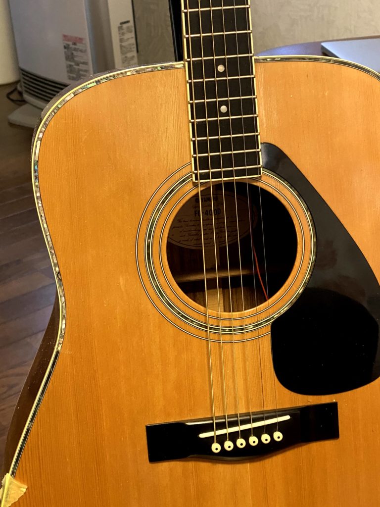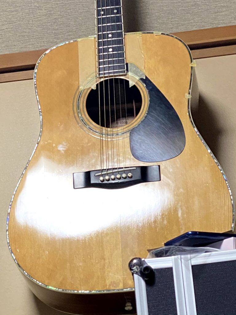 70年代後半、ニューミュージックのアーティストはヤマハのLシリーズカスタムモデルを特注し、ステージで使用していた。さだまさし、長渕剛、雅夢、チャゲ&飛鳥・・・・。中学生にとってはオリジナルのデザインのギターを所有することは、夢物語であった。今でもヤマハのカスタムモデルは存在するが、非常に高価である。ならば自分で作ってしまえと、FGー400Dを中古で入手し、手を加えることにしてみた。ヤマハのカスタムモデルは、YAMAHAオリジナルジャンボのボディーを用いる事が多いが、さだまさしのモデルに憧れがあったので、L‐41に最も近いFG-400Dを本体に選んだ。 まずは、表板のパーフリングとサウンドホールは、セル貝をラミネートアバロンに入れ替え、ついでに指板エンドにもアバロンを彫り込んだ(この際指板エンドを少々切り出した)。ブリッジサイドはスノーフレークのインレイを入れ、ヘッドにはパーフリングをアバロンで彫り込み、指板サイドもアバロンの装飾を入れた。ポジションマークはエレキのSG3000のアロー型が好みだったので、シールで作成した。最後にギターピックアップにMS-6を取り付けした。MS-6はアンプなしでコーラスやエフェクトがかけられる面白いアイテムである。まるでヤマハのアコースティックトランスマグネティックピックアップのようである。