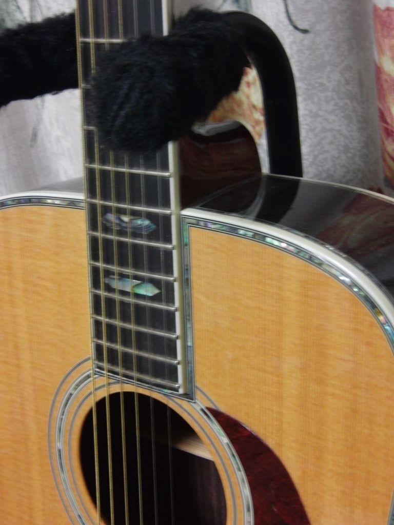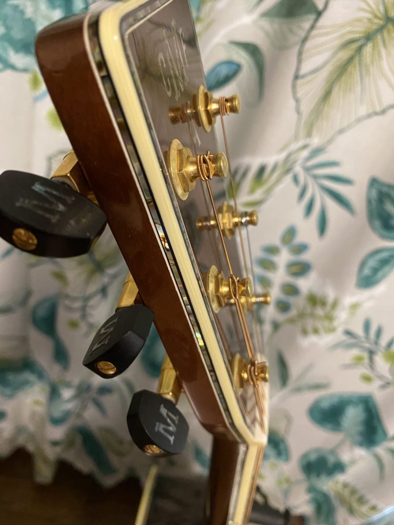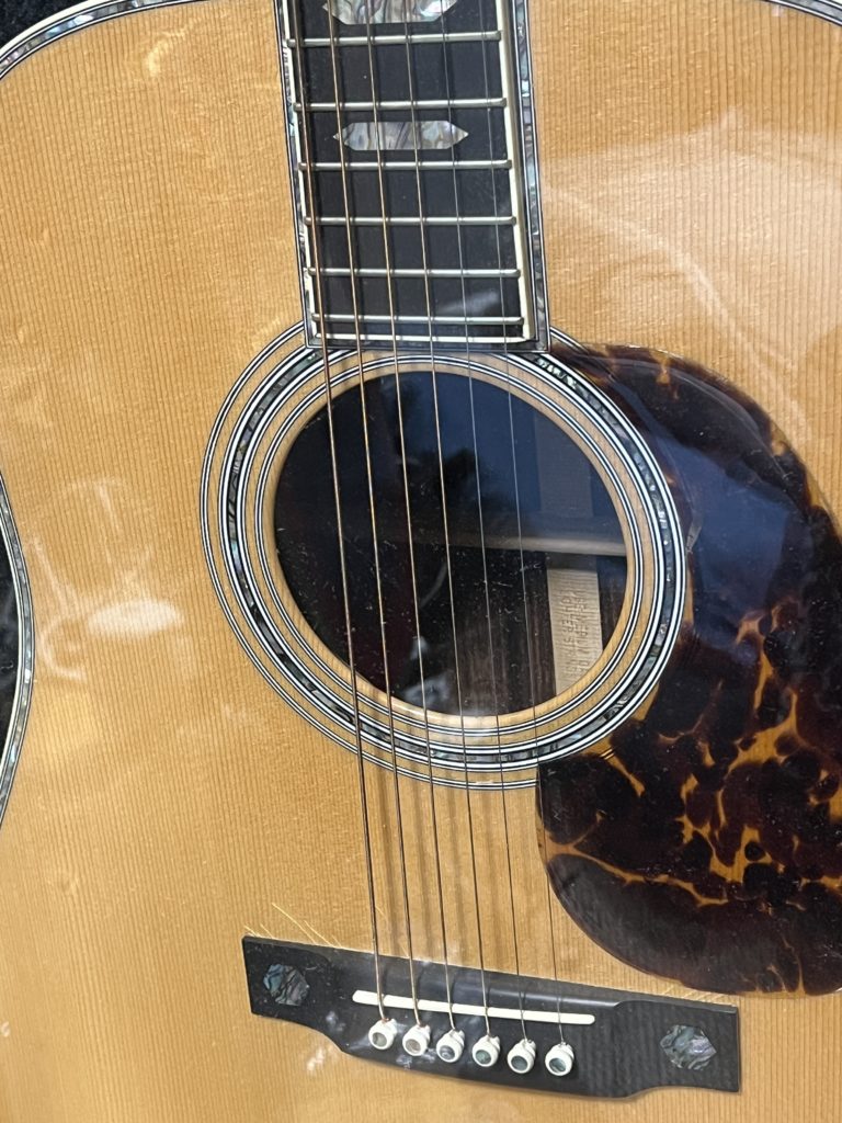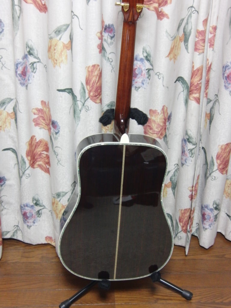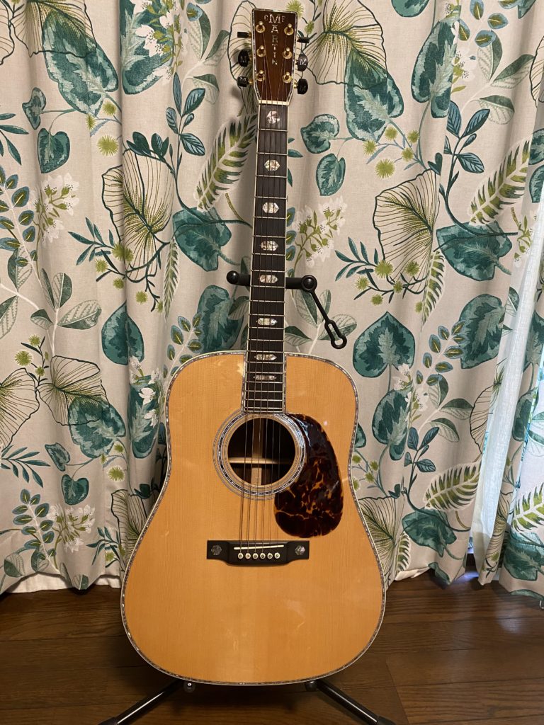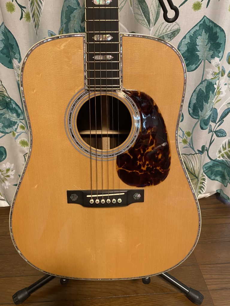 憧れのMARTIN Dー45である。正確にはDーCUSTOMが型番のようである。入手した際は写真のようにピックガードは装着されていなかったのだが、一弾きして“グランドピアノのような響き”と言われるサウンドに驚かされた。ローズウッドのサイドバックだが、これまで聞いたことのないボディーの振動に驚かされた。TOR-TISのピックガードを貼った。カスタムらしくインレイが標準のD-45以上に施されている。2024年に工房にて指板ンサイドにアバロンインレイを追加した。