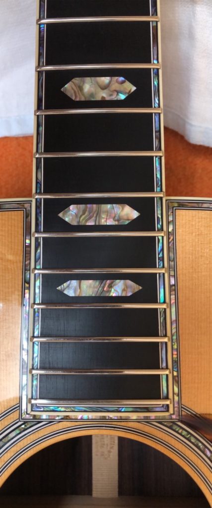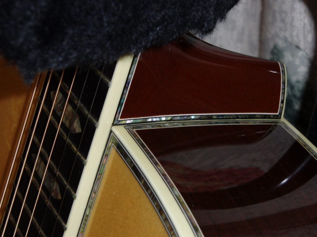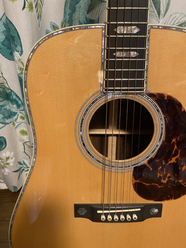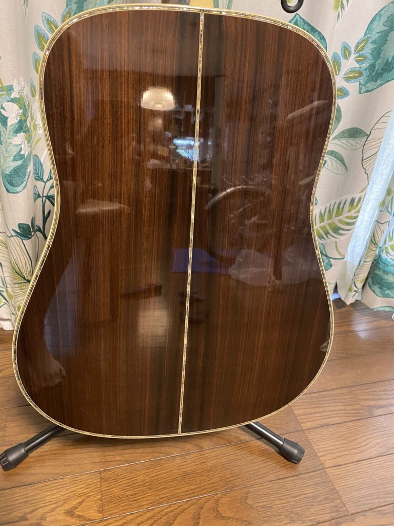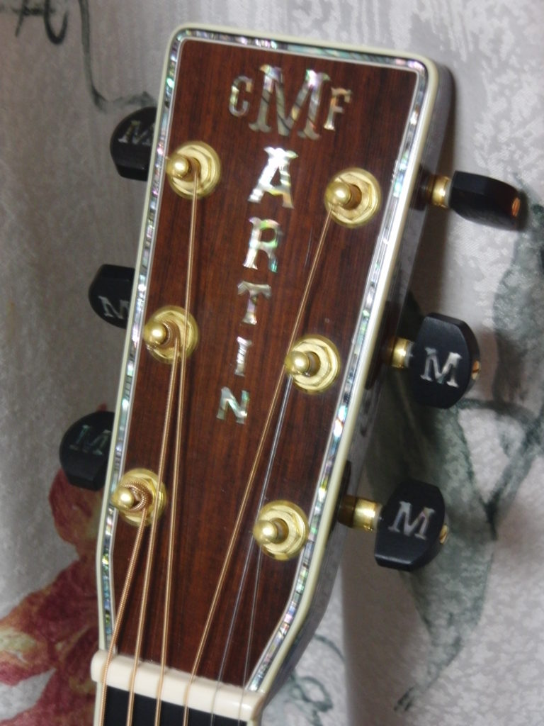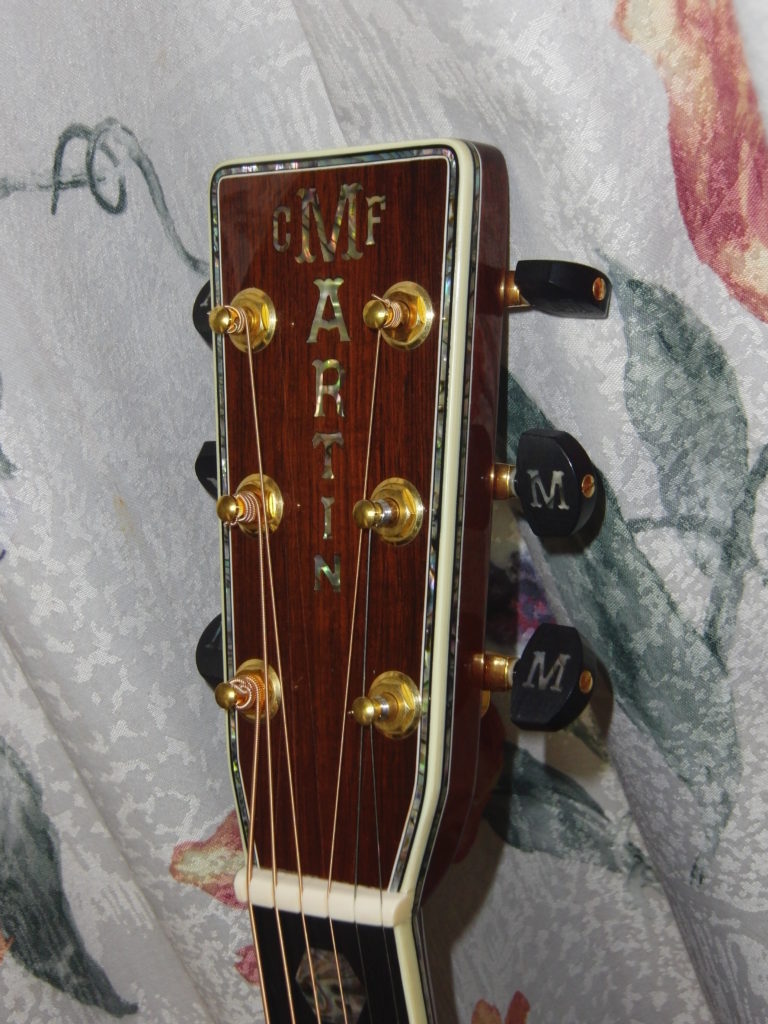 憧れのMARTIN Dー45である。正確にはDーCUSTOMが型番のようである。入手した際は写真のようにピックガードは装着されていなかったのだが、一弾きして“グランドピアノのような響き”と言われるサウンドに驚かされた。ローズウッドのサイドバックだが、これまで聞いたことのないボディーの振動に驚かされた。TOR-TISのピックガードを貼った。カスタムらしくインレイが標準のD-45以上に施されている。2024年に工房にて指板ンサイドにアバロンインレイを追加した。
